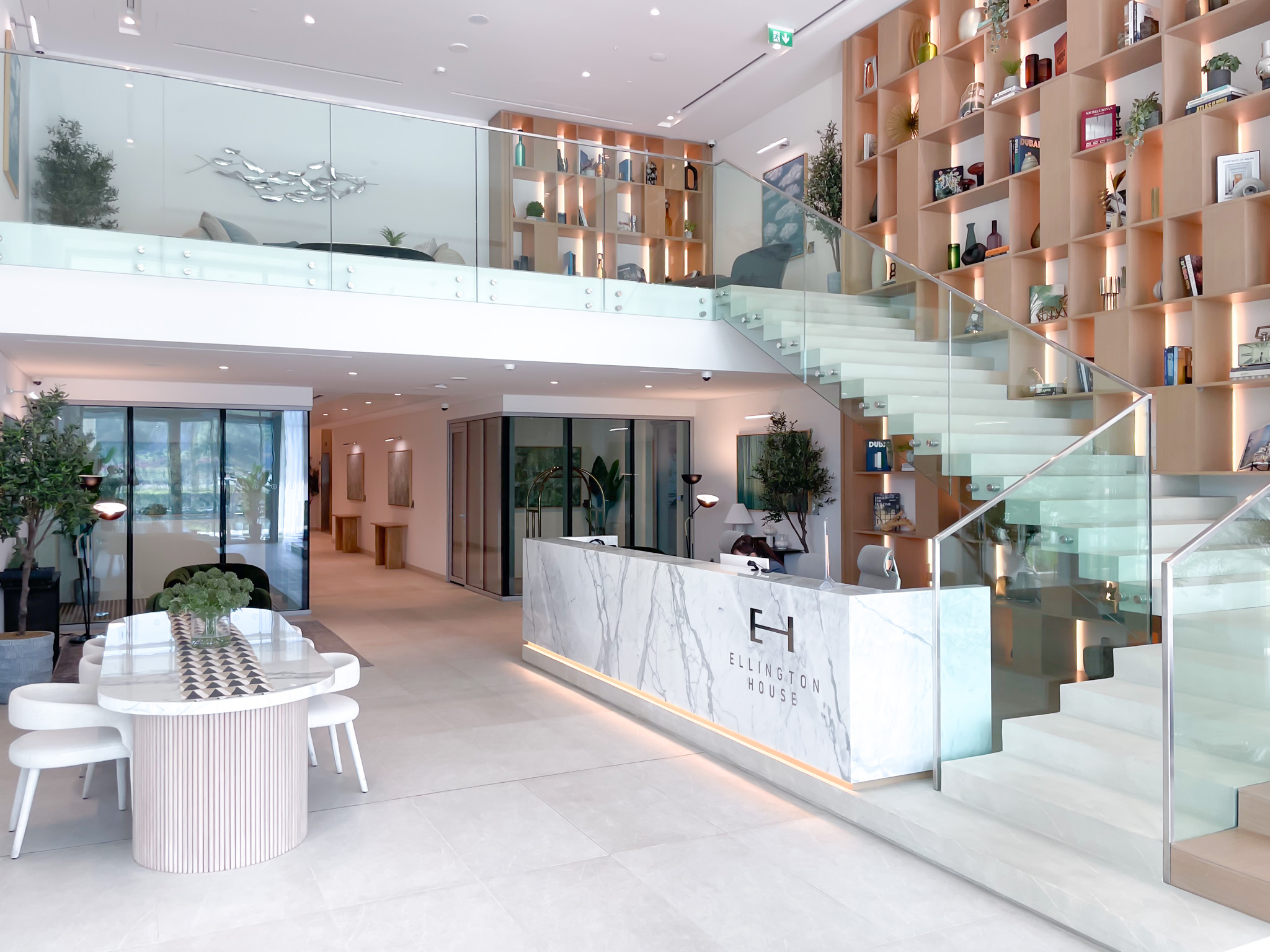 Ellington House offers inviting atmospheres blend seamlessly with thoughtfully designed spaces adorned with locally sourced glass, stone, and metal. The natural color scheme complements the light-tone rendered wall finishes, creating a harmonious ambiance.